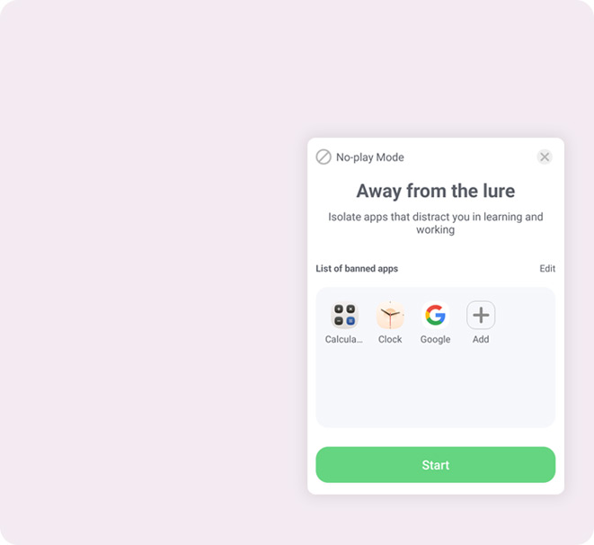 Добавьте приложения, которые Вы желаете использовать во время медитации, не включенные в данный список будут заблокированы, пока режим активен.